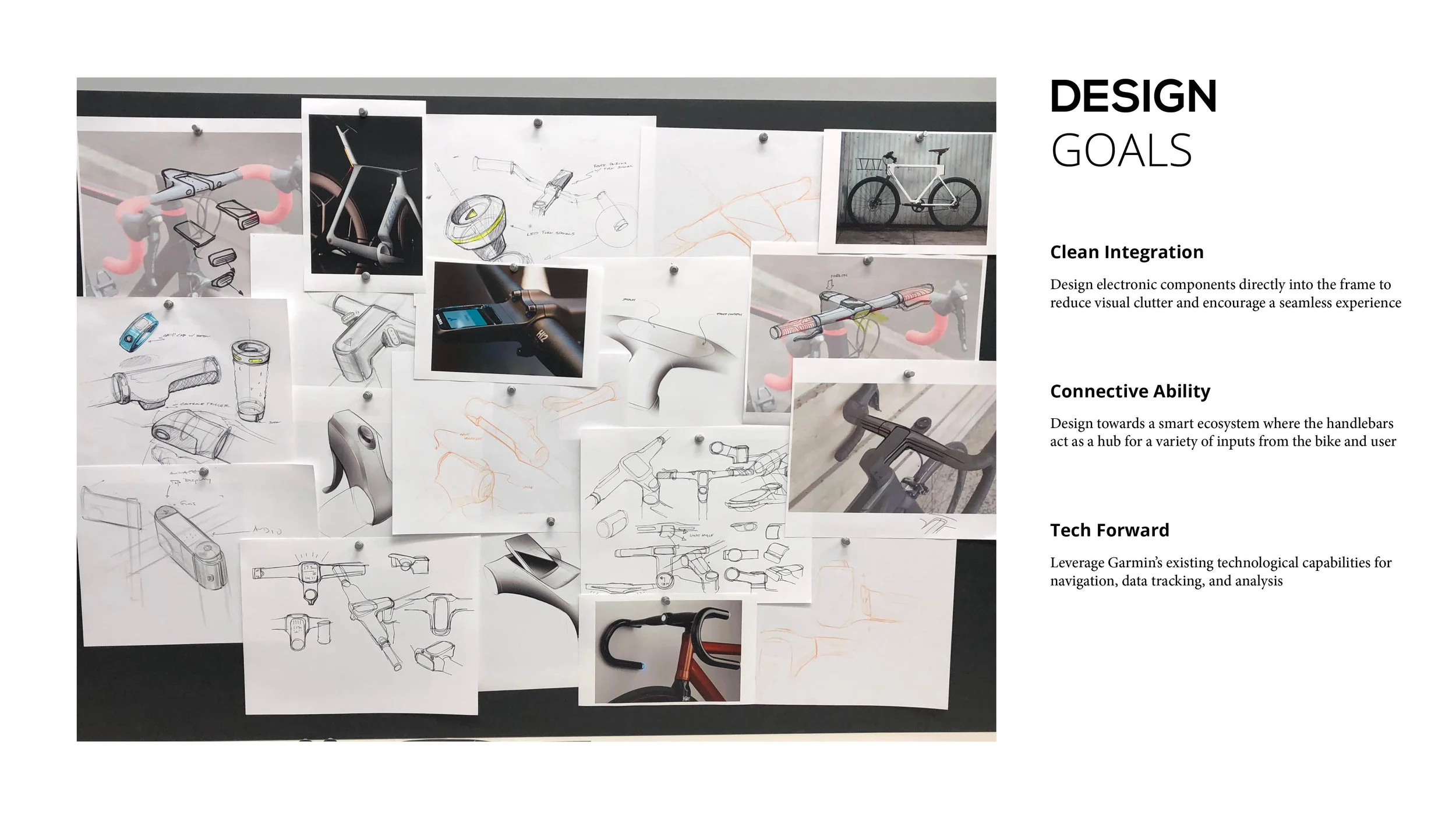 The initial process was broad and fluid, working individually and as a team to imagine how components could be integrated into the E-bike, what interaction could look like, who a typical user would be, and so on. (Sketches directly below from a group brainstorm at Garmin)